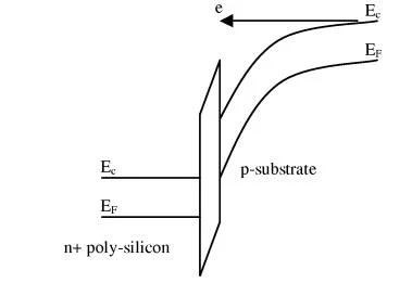 当栅极端子正向偏置时,能带图发生变化,如图2第二张图所示。(b) 。当强反转表面处的电子隧穿进入或穿过SiO层时,产生栅极电流。