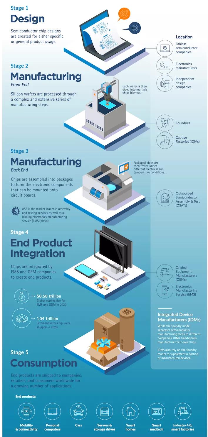 一个涉及数千家公司、数百万人和数十亿美元的集成半导体供应链。这个链条可以分为五个阶段。